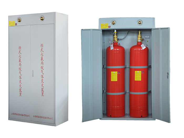 柜式七氟丙烷氣體滅火裝置(雙瓶組)是將滅火劑貯存裝置、連接管、噴頭、信號反饋裝置、電磁閥,氣動型驅(qū)動裝置等部件組裝于儲瓶柜內(nèi)的一種滅火裝置。