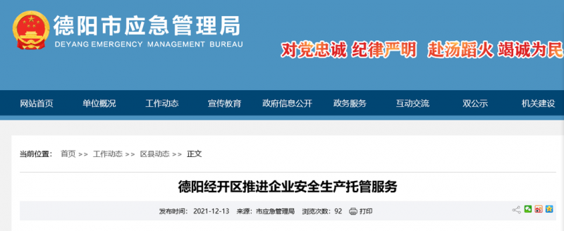 四川省德陽市經開區(qū)于2021年12月9日召開了企業(yè)安全生產托管服務推進會。會議決定2022年全面試點全區(qū)企業(yè)安全生產托管服務。通過托管服務試點,推進企業(yè)落實安全生產主體責任,夯實安全生產基礎、提升安全管理水平,強化“要我安全”到“我要安全”“我會安全、我能安全”的轉變。