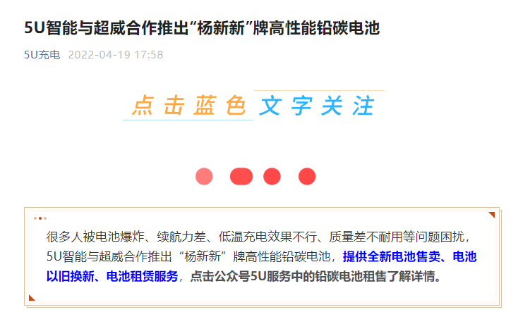 5U智能與超威合作推出“楊新新”牌高性能鉛碳電池,提供全新電池售賣、電池以舊換新、電池租賃服務,旨在解決電池爆炸、續(xù)航力差、低溫充電效果不行、質(zhì)量差不耐用等問題。