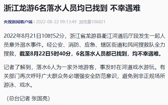 據(jù)央視新聞客戶端消息,2022年8月21日10時(shí)52分,浙江省龍游縣衢江河道后廳段發(fā)生一起人員意外溺水事件。經(jīng)公安、消防、應(yīng)急、轄區(qū)街道和民間搜救隊(duì)全力搜救,截至8月22日5時(shí)40分,6名落水人員都已找到,均不幸遇難。