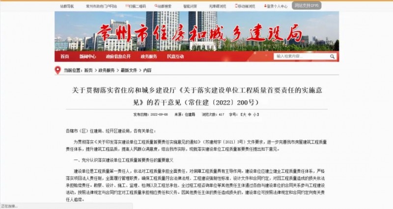 近日,江蘇省常州市住建局發(fā)布關(guān)于貫徹落實(shí)省住房和城鄉(xiāng)建設(shè)廳《關(guān)于落實(shí)建設(shè)單位工程質(zhì)量首要責(zé)任的實(shí)施意見(jiàn)》的若干意見(jiàn),明確建設(shè)單位是工程質(zhì)量第一責(zé)任人。