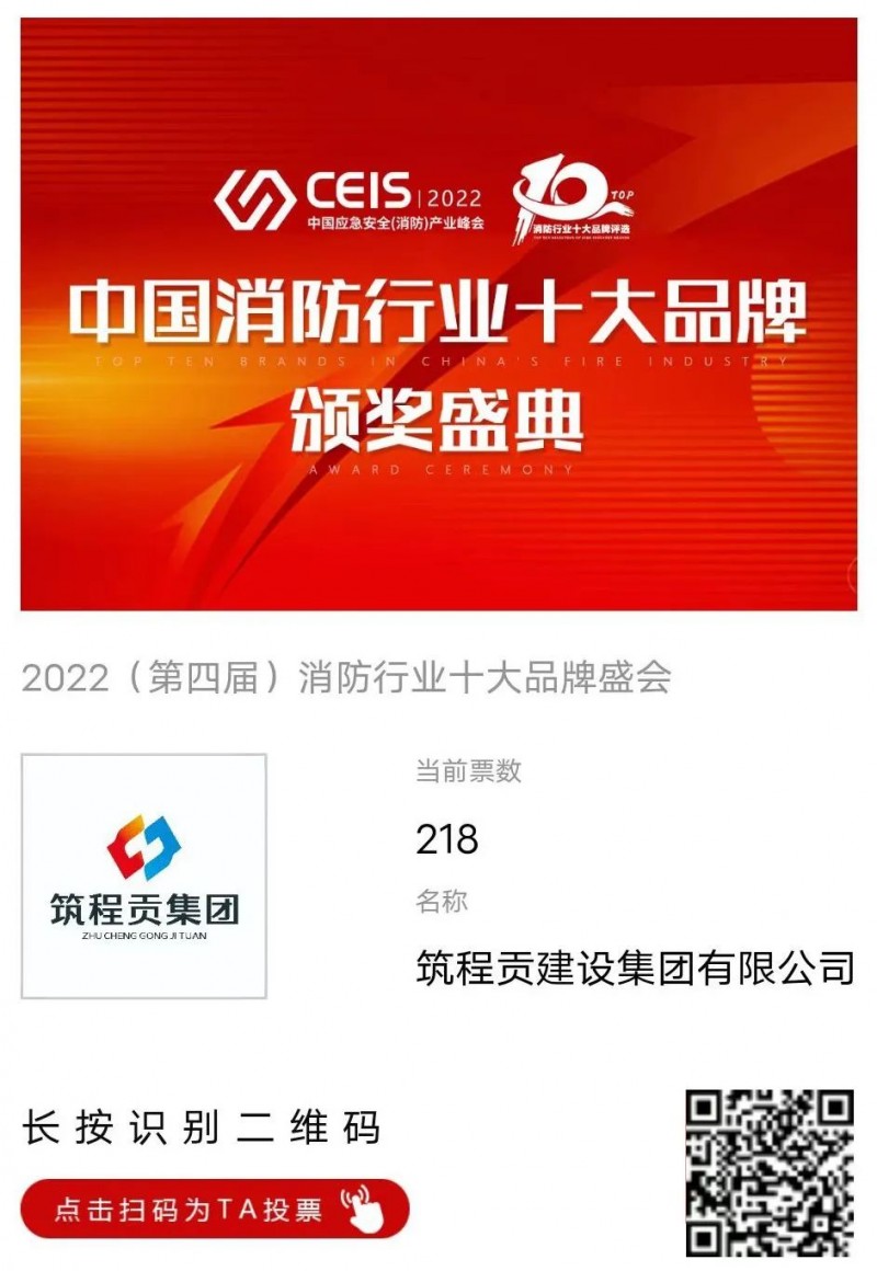 吹響新號(hào)角,踏上新征程,筑程貢集團(tuán)繼續(xù)參與2022中國消防行業(yè)十大品牌評選活動(dòng),角逐“消防工程十大品牌”、“消防維保檢測十大品牌”兩個(gè)獎(jiǎng)項(xiàng)。