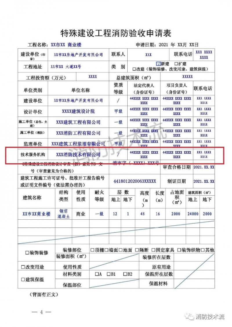 2.《建設(shè)工程消防設(shè)計(jì)審查驗(yàn)收工作細(xì)則》附錄《建設(shè)工程消防設(shè)計(jì)審查、消防驗(yàn)收、備案和抽查文書式樣》填表說(shuō)明第10點(diǎn):建設(shè)單位如在施工過(guò)程中自行完成消防設(shè)施檢測(cè),或在建設(shè)工程竣工驗(yàn)收消防查驗(yàn)時(shí)自行完成消防設(shè)施性能、系統(tǒng)功能聯(lián)動(dòng)調(diào)試,《特殊建設(shè)工程消防驗(yàn)收申請(qǐng)表》和《建設(shè)工程消防驗(yàn)收備案表》中“技術(shù)服務(wù)機(jī)構(gòu)”一欄可由建設(shè)單位填寫并簽名加蓋公章確認(rèn)。
