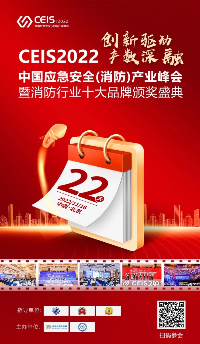 距離CEIS2022中國應急安全(消防)產(chǎn)業(yè)峰會暨消防行業(yè)十大品牌頒獎盛典倒計時22天!誠邀您共赴盛會。探討產(chǎn)業(yè)發(fā)展趨勢,共同為應急安全事業(yè)賦能!