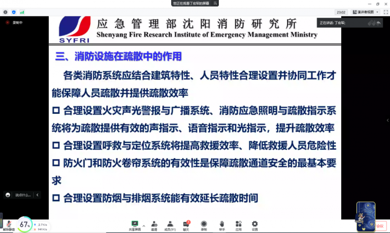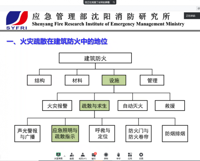 在專家分享環(huán)節(jié),應(yīng)急管理部沈陽消防研究所研究員、國家消防電子產(chǎn)品質(zhì)量監(jiān)督檢驗中心副主任丁宏軍,主要圍繞智能疏散系統(tǒng)(產(chǎn)品)多場景智能化應(yīng)用等內(nèi)容進(jìn)行講解。