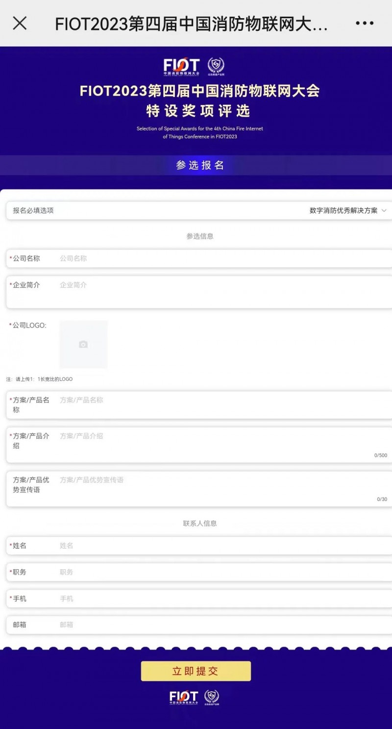 ②第二步:進(jìn)入報(bào)名界面,填寫企業(yè)報(bào)名信息,上傳企業(yè)logo(1:1,大小不超過(guò)1M),點(diǎn)擊“立即提交”,提示“報(bào)名成功”,待審核成功后,展示到前端頁(yè)面。