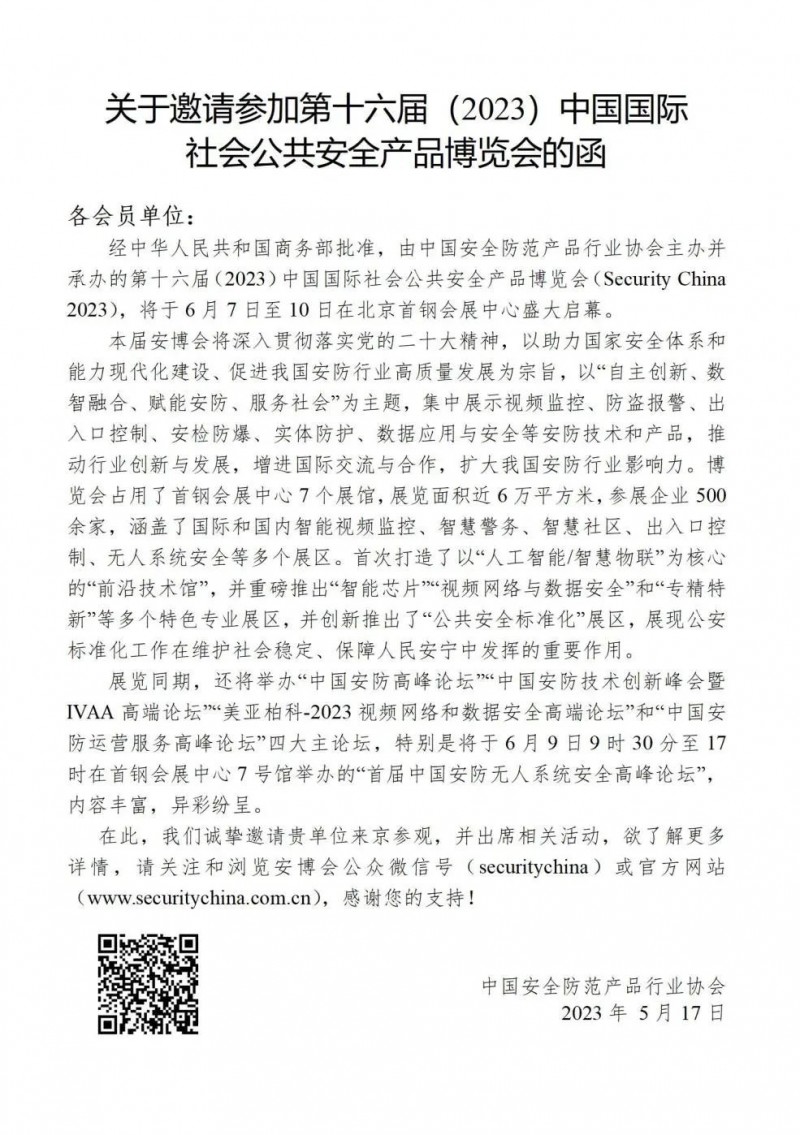 關(guān)于邀請參加第十六屆(2023)中國國際社會公共安全產(chǎn)品博覽會的函