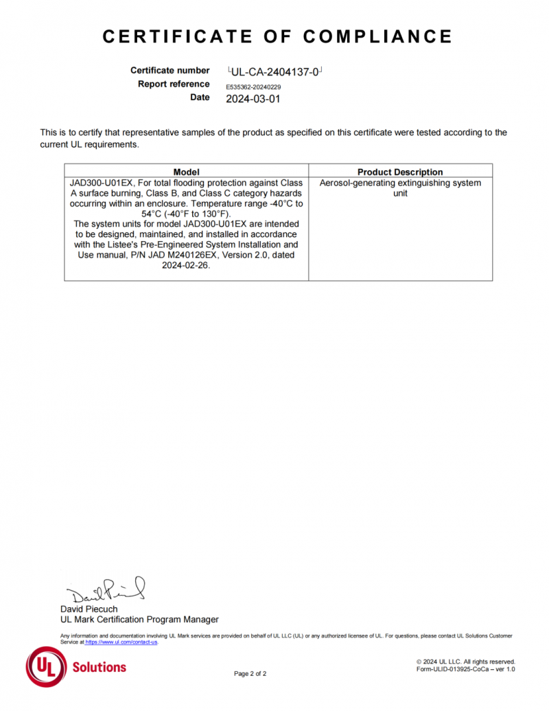 日前,由湖北及安盾消防科技有限公司自主研發(fā)生產(chǎn)的JAD300-U01EX氣溶膠滅火裝置通過UL Solutions防爆認(rèn)證。