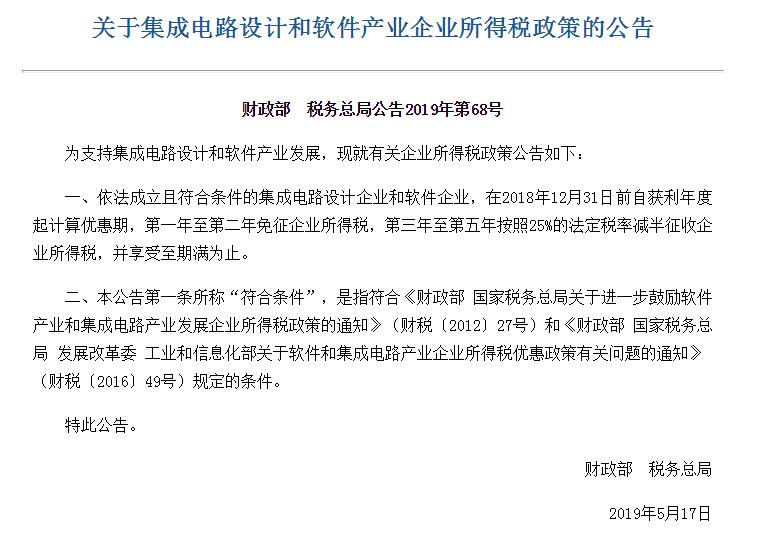 5月22日,財政部、國家稅務(wù)總局發(fā)布了《關(guān)于集成電路設(shè)計和軟件產(chǎn)業(yè)企業(yè)所得稅政策的公告》,依法成立且符合條件的集成電路設(shè)計企業(yè)和軟件企業(yè),在2018年12月31日前自獲利年度起計算優(yōu)惠期,第一年至第二年免征企業(yè)所得稅,第三年至第五年按照25%的法定稅率減半征收企業(yè)所得稅,并享受至期滿為止。稅收優(yōu)惠政策無疑利好集成電路設(shè)計產(chǎn)業(yè)。