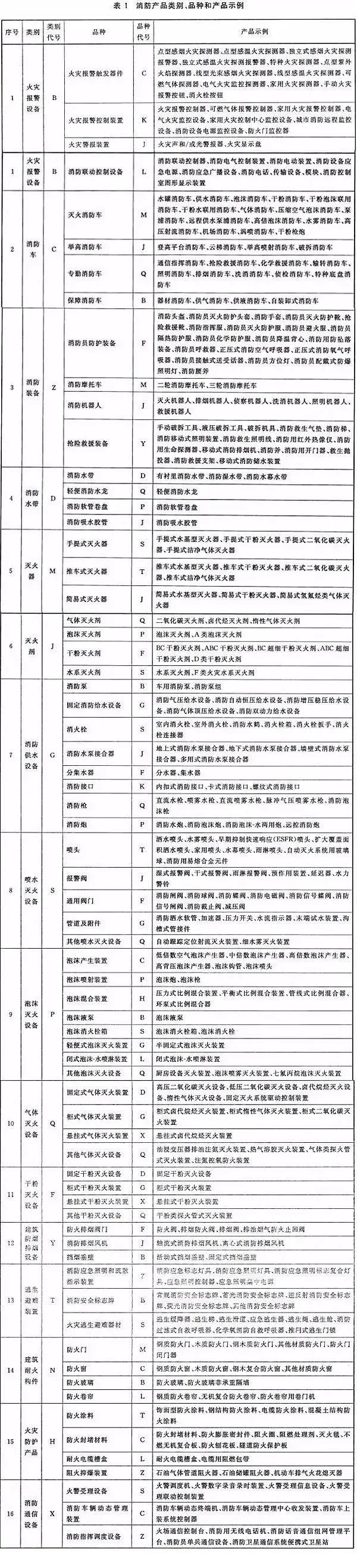 ③ 表1中未包含的消防新產(chǎn)品,其類別和品種代號可由產(chǎn)品歸口管理部門具體規(guī)定。