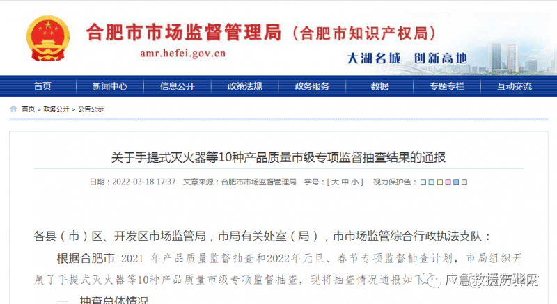 近日,合肥市市場監(jiān)督管理局通報手提式滅火器等10種產(chǎn)品質(zhì)量市級專項監(jiān)督抽查結(jié)果。