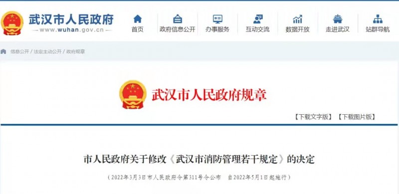 近日,武漢市政府召開(kāi)第4次常務(wù)會(huì)議審議通過(guò)了《市人民政府關(guān)于修改<武漢市消防管理若干規(guī)定>的決定》,根據(jù)《決定》修訂的《武漢市消防管理規(guī)定》自2022年5月1日起正式施行。