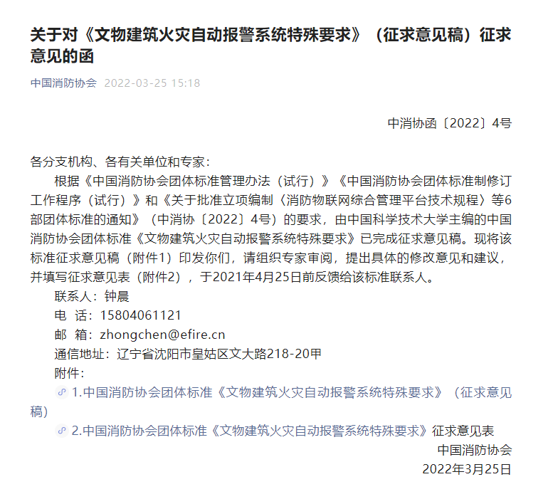 根據(jù)《中國(guó)消防協(xié)會(huì)團(tuán)體標(biāo)準(zhǔn)管理辦法(試行)》《中國(guó)消防協(xié)會(huì)團(tuán)體標(biāo)準(zhǔn)制修訂工作程序(試行)》和《關(guān)于批準(zhǔn)立項(xiàng)編制〈消防物聯(lián)網(wǎng)綜合管理平臺(tái)技術(shù)規(guī)程〉等6部團(tuán)體標(biāo)準(zhǔn)的通知》的要求,由中國(guó)科學(xué)技術(shù)大學(xué)主編的中國(guó)消防協(xié)會(huì)團(tuán)體標(biāo)準(zhǔn)《文物建筑火災(zāi)自動(dòng)報(bào)警系統(tǒng)特殊要求》已完成征求意見(jiàn)稿?,F(xiàn)經(jīng)專(zhuān)家審閱,形成修改意見(jiàn)和建議?,F(xiàn)對(duì)外征集意見(jiàn)。