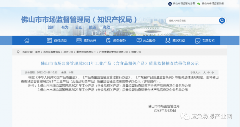 2022年3月28日,廣東省佛山市市場監(jiān)督管理局網(wǎng)站公示2021年工業(yè)產(chǎn)品(含食品相關(guān)產(chǎn)品)質(zhì)量監(jiān)督抽查結(jié)果。其中,10批次消防產(chǎn)品不合格。