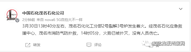 3月30日13時40分左右,茂名石化化工分部2號裂解3號爐發(fā)生著火。經(jīng)茂名石化應急救援中心、茂名市消防氣防撲救,14時05分,火勢已被撲滅,沒有人員傷亡。