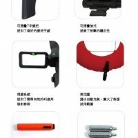 產(chǎn)品配備可折疊后托,提高了射擊的穩(wěn)定性;配備可折疊T字握把,提供了極好的握持手感;配備視窗系統(tǒng),提供了簡潔有效的45度角發(fā)射參照;配備救生圈,遇水自動充氣,擴大了救援的適用范圍。